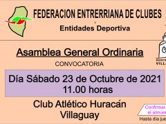 La Federación Entrerriana de Clubes y Entidades Deportiva, realizará la Asamblea General Ordinaria el próximo día 23 de Octubre de 2021 en la localidad de Villaguay.-